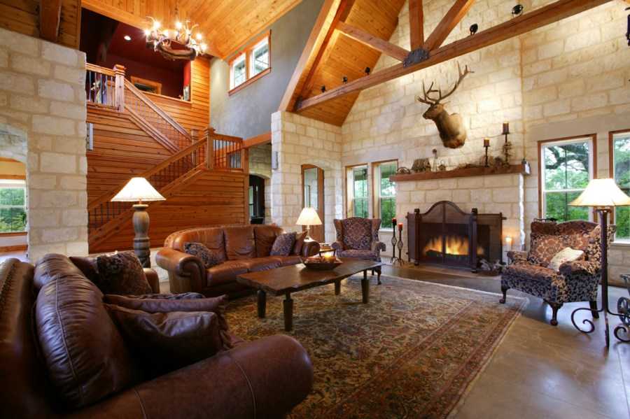 Если гостиная в частном доме, то можно сделать камин. Причем не обязательно делать встроенный, достаточно даже имитации. В квартире он будет выглядеть не совсем уместно. Он всегда является частичкой уюта большого дома, ведь даже просто блики огня помогают успокоиться и настроиться на релакс.