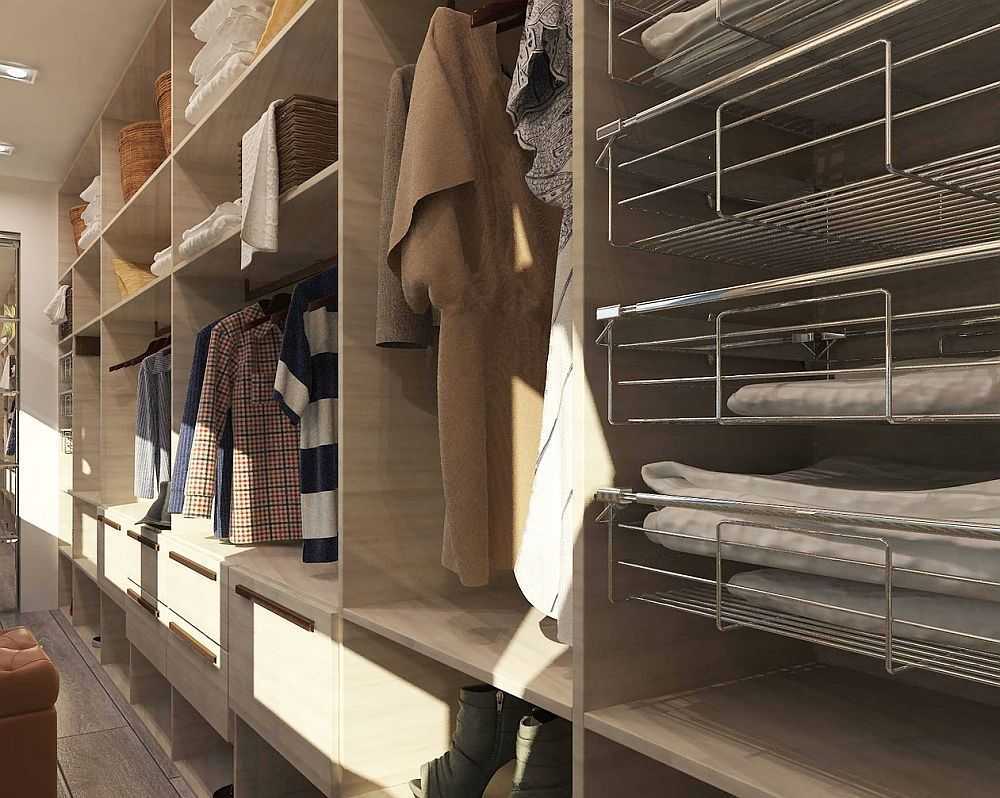 Оснастить гардеробную можно по-разному. Вы можете купить выдвижные ящики, скрывающиеся за дорогими деревянными фасадами и дополнить их механизированными вешалками или сконструировать стойки под одежду из подручных материалов и задействовать в обустройстве пространства пластиковые корзины. А чем оснащают гардеробные профессионалы?