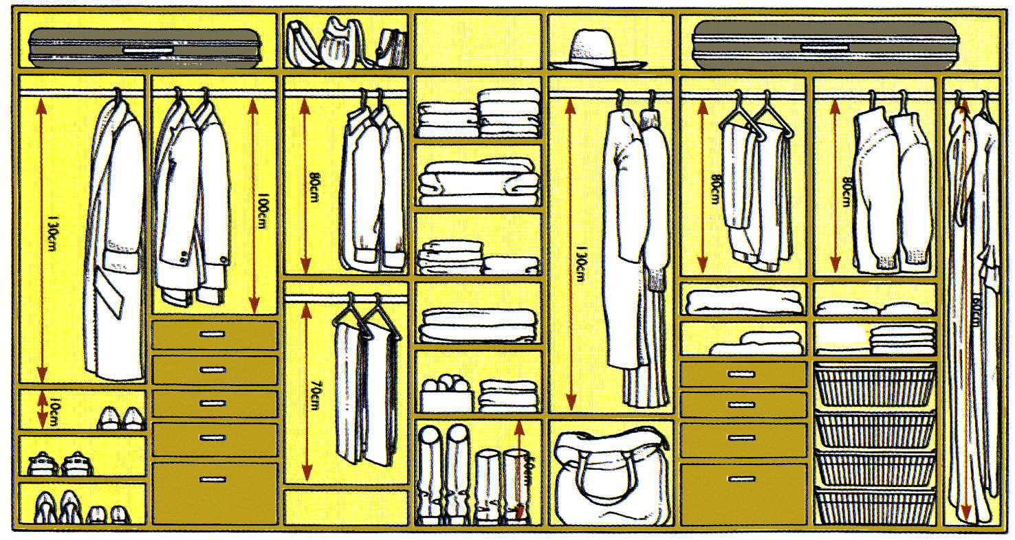 Измерьте длину одежды, которая будет висеть, для определения высоты отсеков. Таким же образом определите глубину выдвижных ящиков.