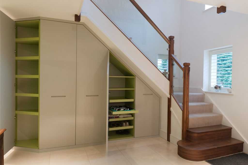 Если дома есть лестница, под ней обязательно имеется свободное место. Здесь можно обустроить гардеробную комнату – она будет скрыта от глаз, не будет скрадывать пространство. Это идеально. Можно собрать специальные выдвижные конструкции и корпус из дерева и фанеры, которые будут скрываться в подлестничном пространстве.