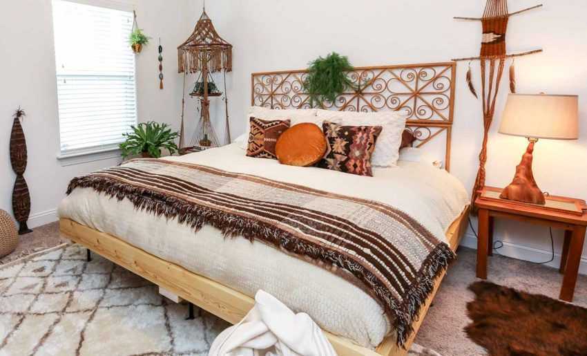 Теперь рассмотрим несколько интересных интерьеров больших спален. Начнем с этнического дизайна в превосходной коричневой гамме с белым текстилем. В центре комнаты находится кровать с балдахином, а по периметру равномерно расположены все необходимые функциональные зоны.