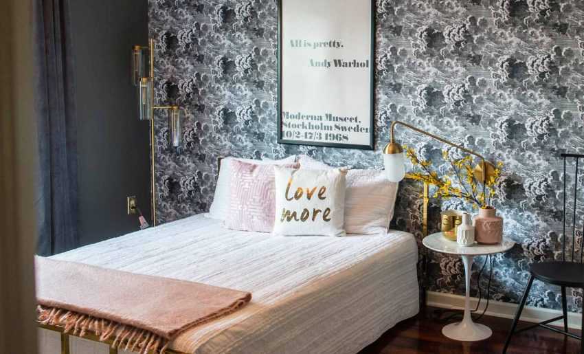 При выборе обоев в маленькую спальню отдавать предпочтение желательно умеренному рисунку. Обои с частым, мелким принтом в условиях ограниченной площади оказывают угнетающее воздействие.