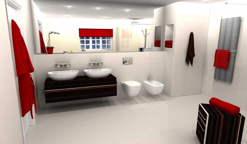 Вместе с белым цветом в ограниченном пространстве санузла допускается сочетать только один яркий цвет: красный, желтый, голубой, зеленый. Классическое сочетание — черный и белый. Обилие ярких цветов в маленькой комнате раздражает. Поэтому даже гармоничный желтый и салатовый оттенок в интерьерах «хрущевских» ванных редко встречается без белого фона.