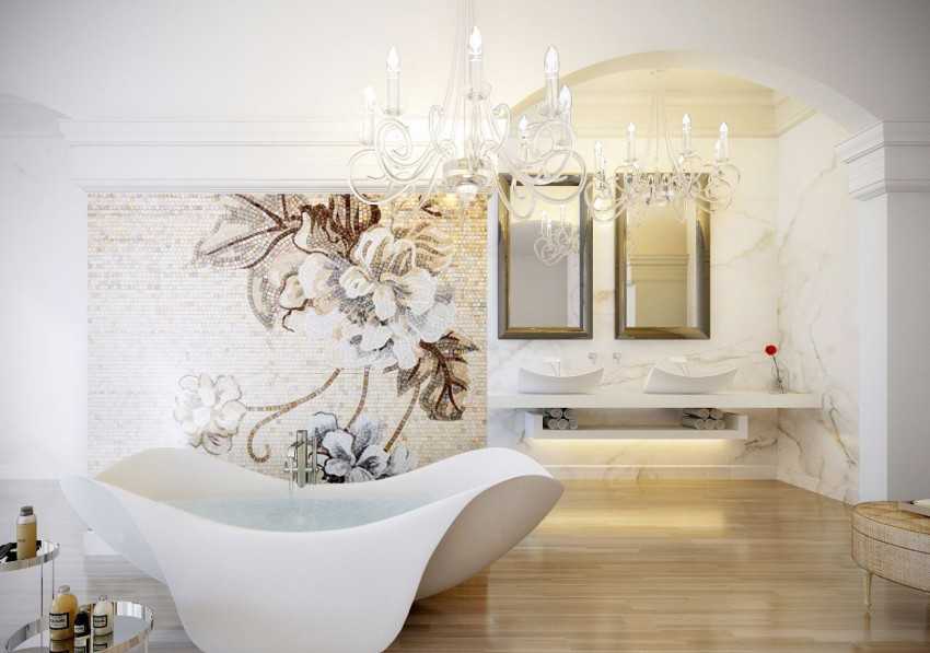 Можно выбрать мозаику для отдельных участков стены, возле раковины или зеркала.