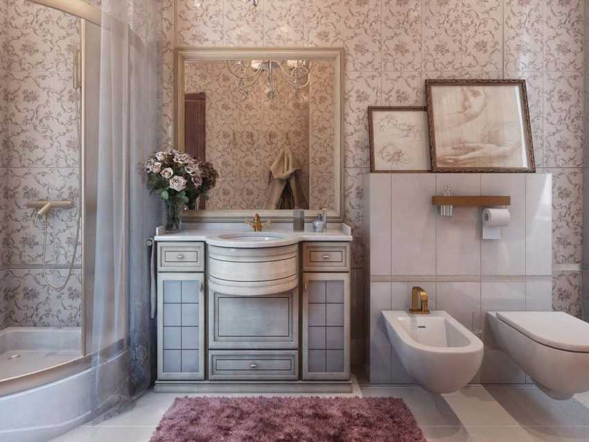 Оттенки во «французской» уборной используются светлые, пастельные. Стены лучше всего отделать однотонным кафелем, дополненным бордюром с нежным рисунком. Часто в таких ванных вешаются зеркала и изящные светильники.