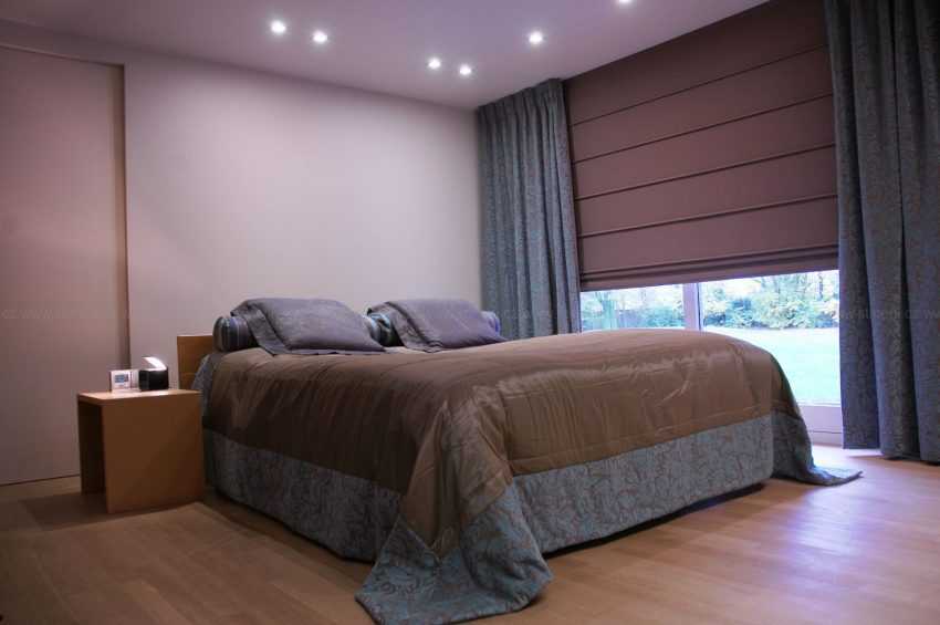 В спальне никак не обойтись без текстиля, но все же в узкой комнате откажись от слишком фактурных тканей, объемных занавесок и других гиперболизированных вещей. Тяжелые портьеры даже у короткой стены не исправят геометрию, а только утяжелят комнату. Лучше выбери тонкие ткани на подкладке блэкаут без сложных ламбрекенов и многослойных композиций или даже рулонные римские шторы.