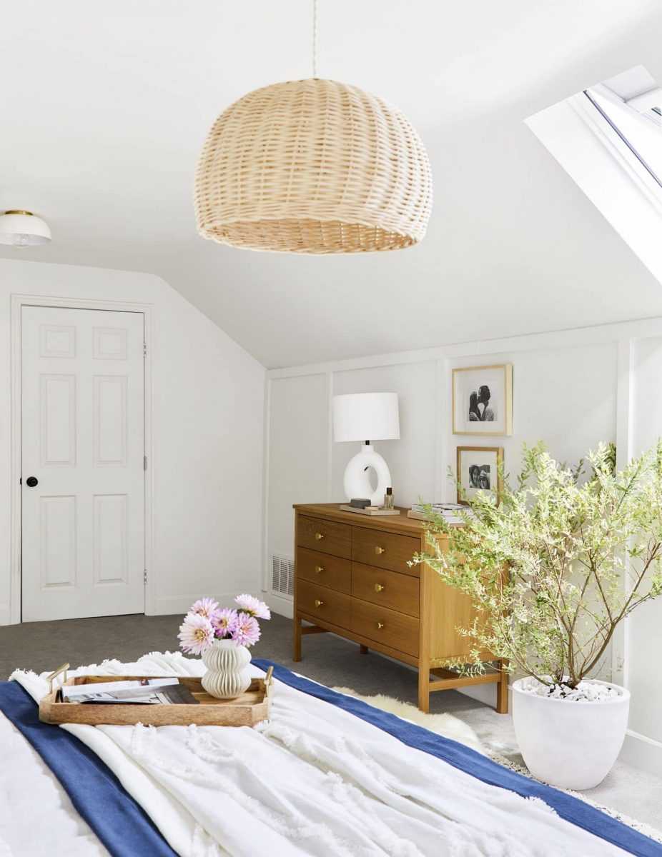 Очень необычным, но интересным решением оказалось окрасить всю комнату в белый цвет, а после завесить окна с двух сторон белым непрозрачным тюлем. Кровать и тумбочка выбраны тоже белые, зато вот текстиль – покрывало и подушки, притягивают взгляд ярким узором. Еще пару ярких пятен представляют собой круглые цветочные композиции. Из освещения выбраны точечные светильники под потолком и пара люстр на длинных шнурах.