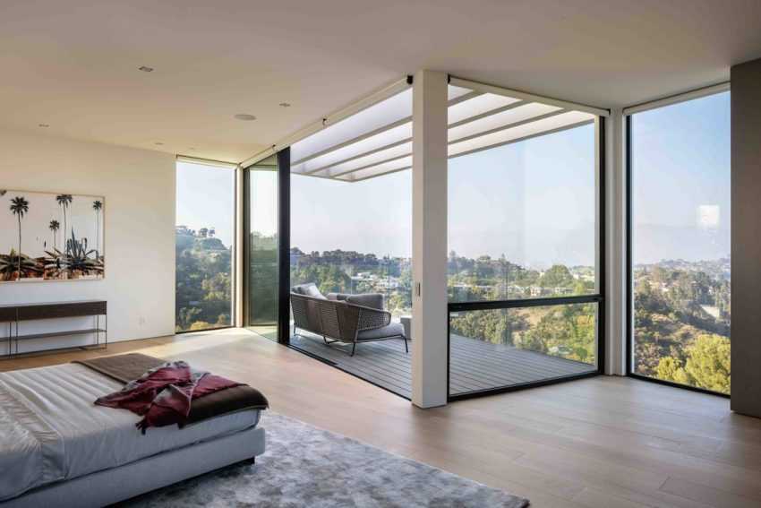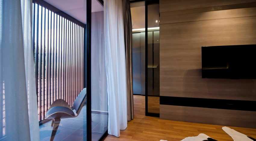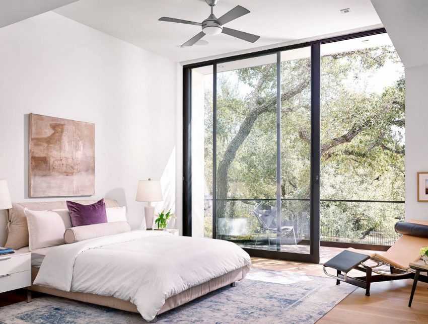 Для лучшей освещённости комнаты используйте стеклянную стенку. Снабжённые шторами, они укроют спальню от света или посторонних глаз, когда это необходимо.
