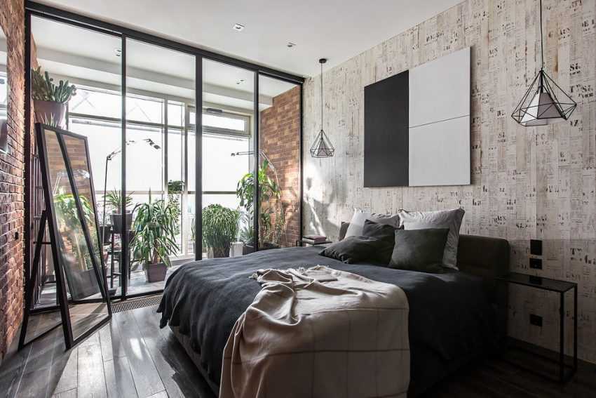 - Если выбирать для спальной комнаты лофт, то для него присущи темные цвета. Чтобы разбавить их, можно сделать светлый потолок;