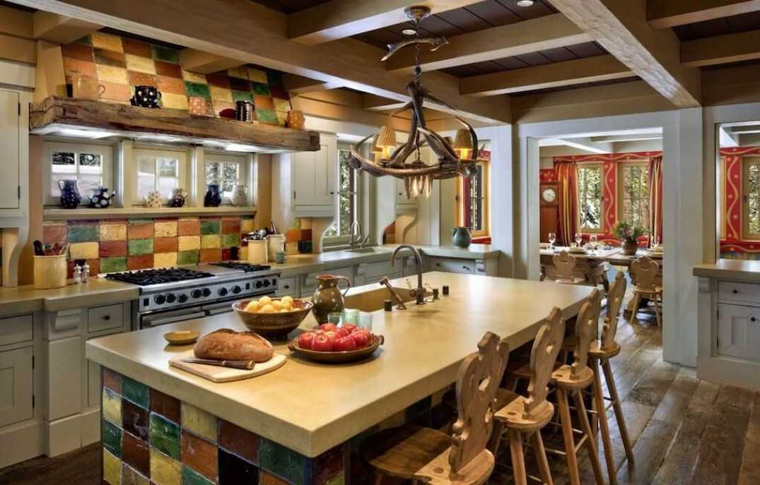 На кухне в основном оставляют натуральное бревенчатое исполнение стен. Иногда в зависимости от стилевого решения в качестве отделки применяют штукатурку или покраску. Фартук выкладывают керамикой, например, выполненной под пэчворк.