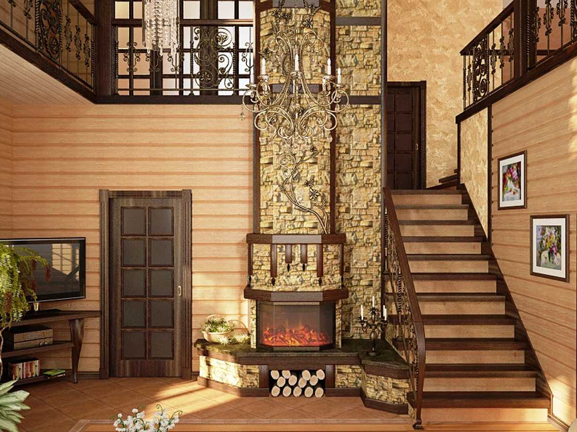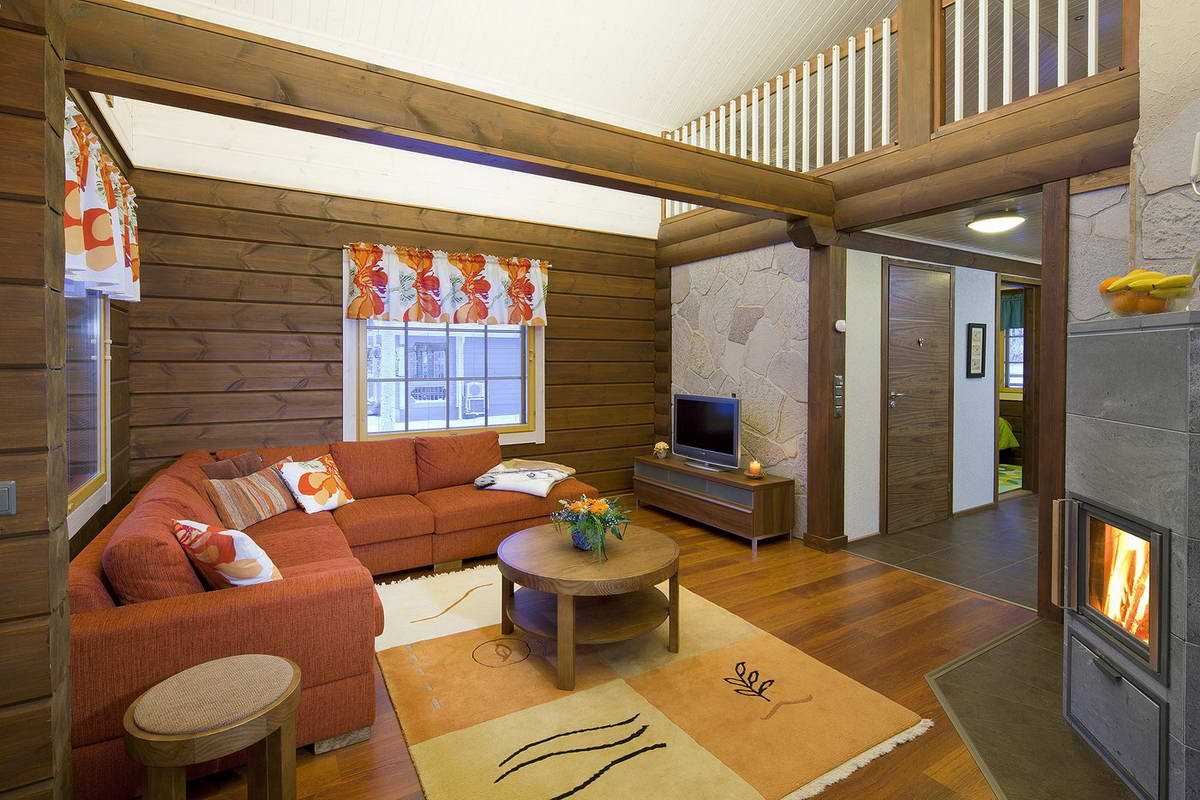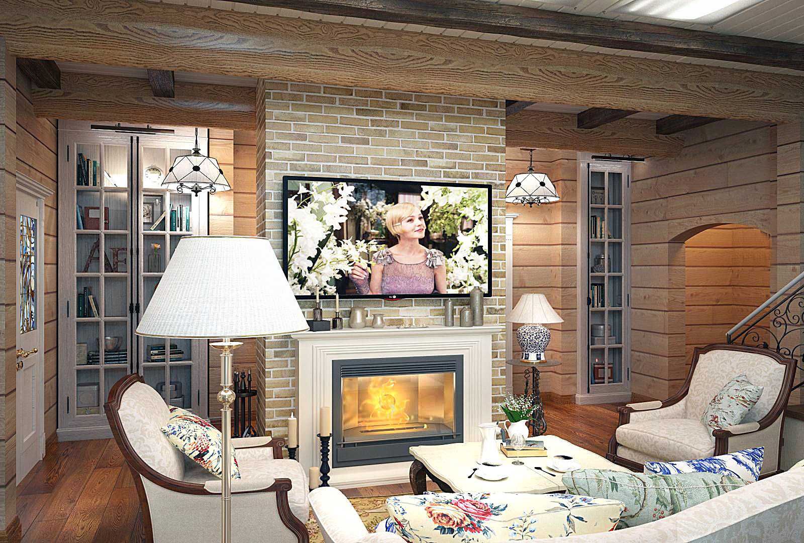 В интерьере гостиной главным центральным элементом обстановки может стать камин, декорированный с помощью чугунной решетки, трубы или облицованный каменной кладкой и жаростойкой плиткой. Первозданный вид стен, покрывают при помощи лака или краски в светлых тонах, для сохранения естественной древесной фактуры.