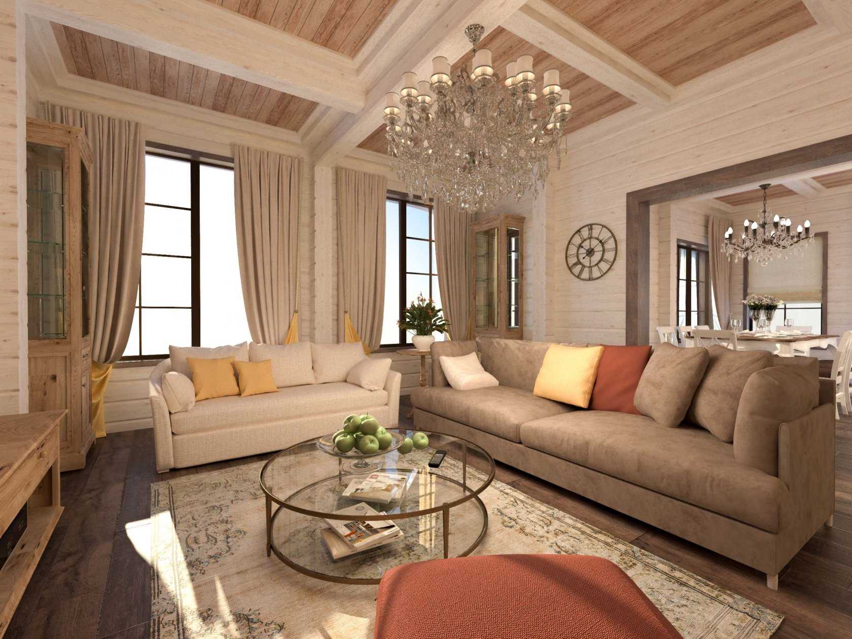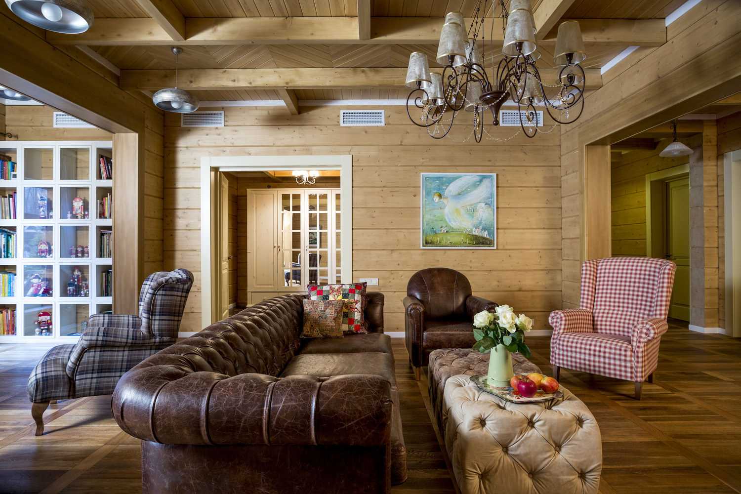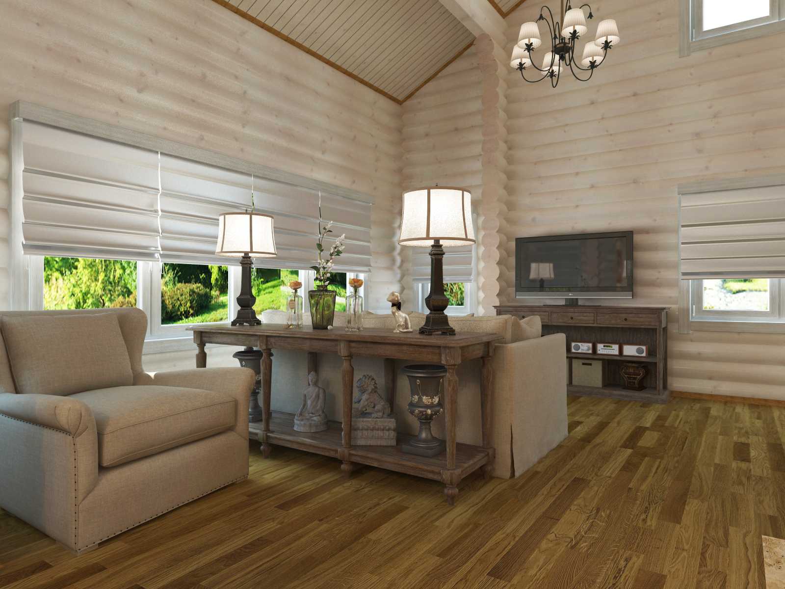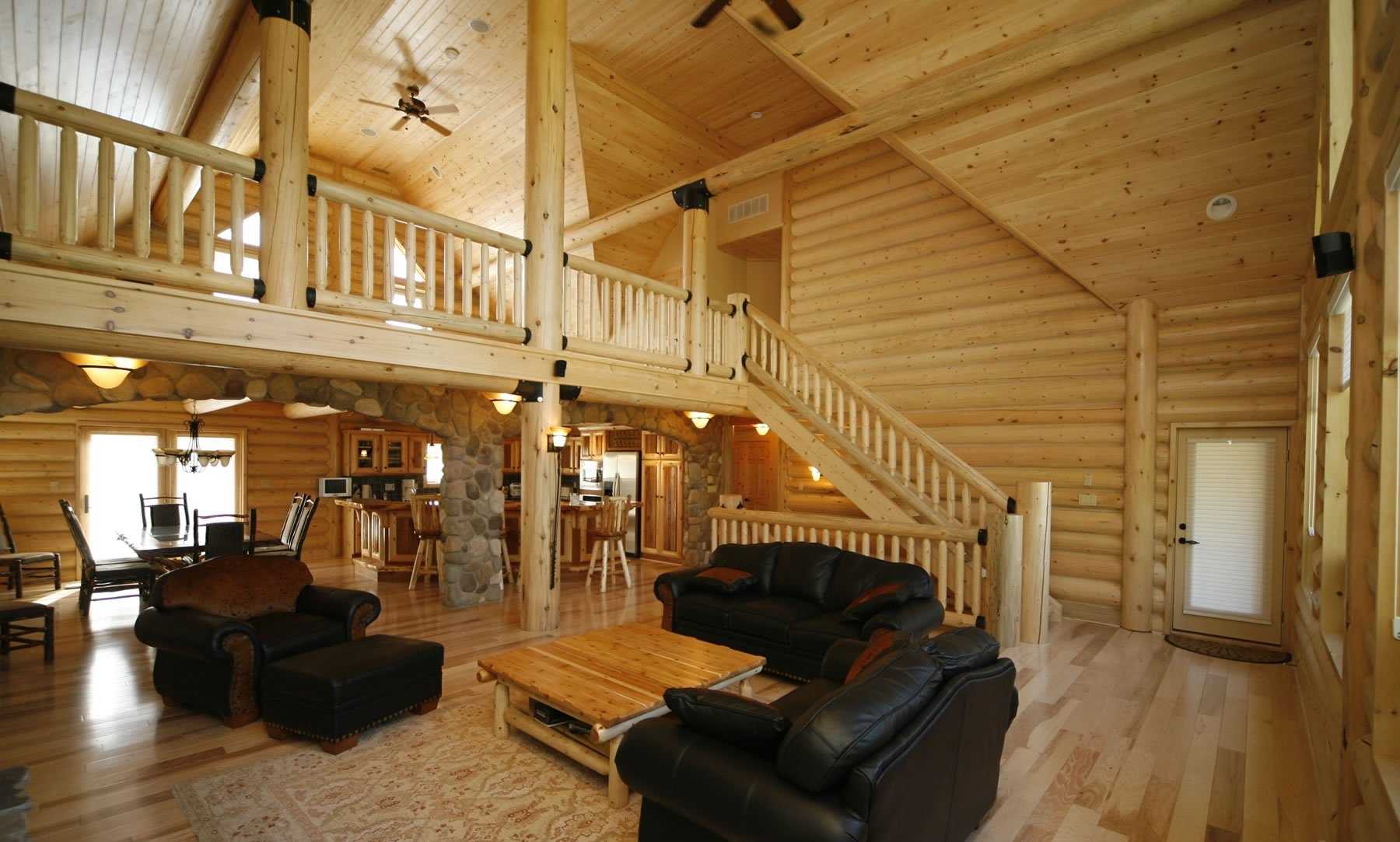 Модерн, как стиль интерьера дома из оцилиндрованного бревна фото показывает полноту этого направления