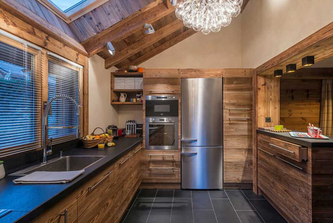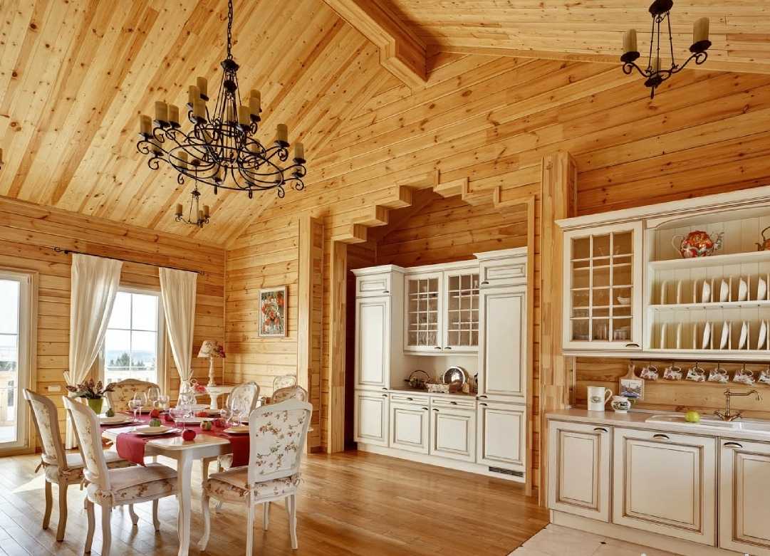 - Цвет. Для внутреннего оформления деревянных домов чаще всего используется сосна. Сам по себе материал достаточно светлый, но со временем он темнеет — это надо учитывать при выборе кухонного гарнитура и прочей мебели. Помимо этого, для дерева всегда требуется больше освещения, чем для «стандартных» кухонь.