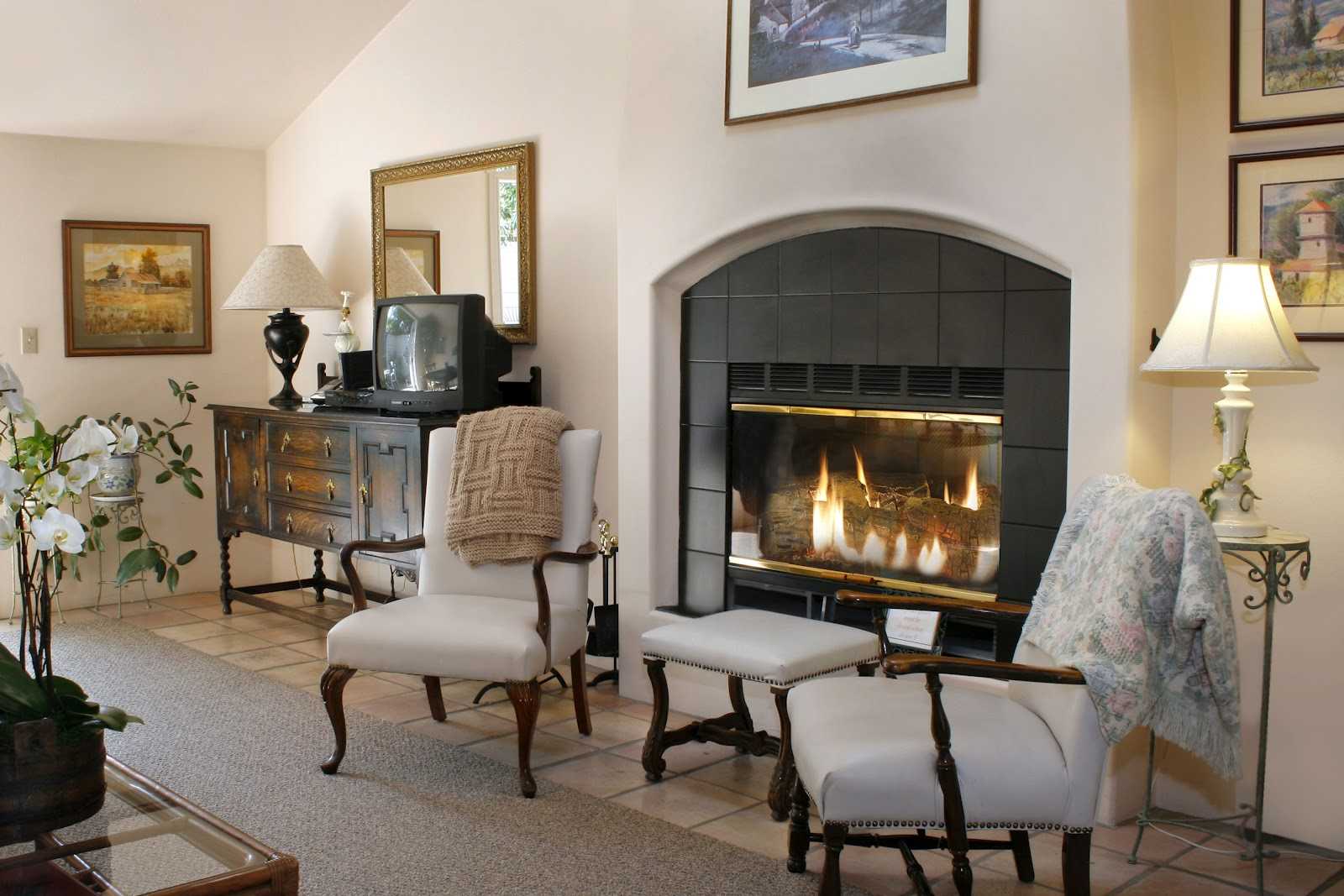Контрастное сочетание с деревом создает каменная кладка, которой оформляют тв-зону или место возле камина. При наличии высокого потолка, его декорируют балками темного цвета. В гостиной с низким потолком применяют деревянные панели или краску в пастельных оттенках. Комнату желательно не загромождать мебельными предметами. Достаточно установки дивана, кресел и журнального столика.