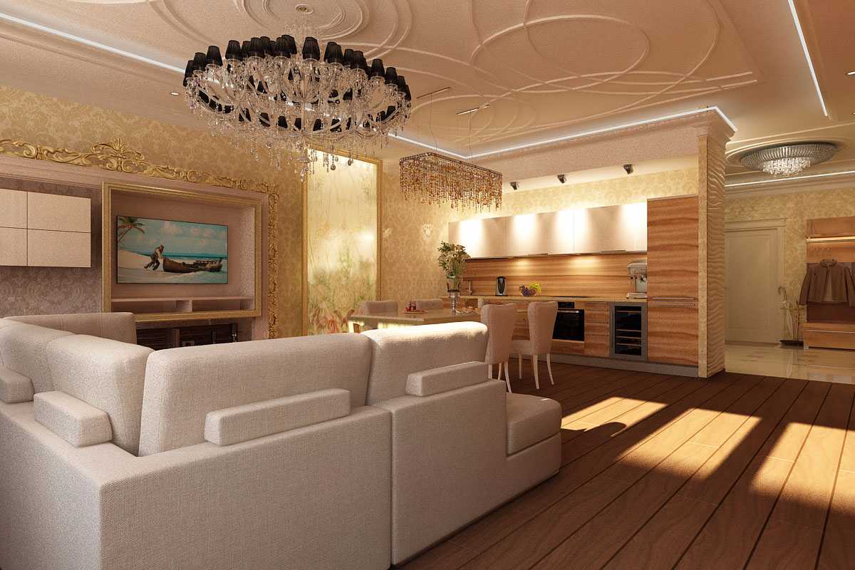 - Для гостиной уместны яркие тона внутренней отделки. Можно выделить гостевую зону отдельной потолочной композицией и обособленной подсветкой.