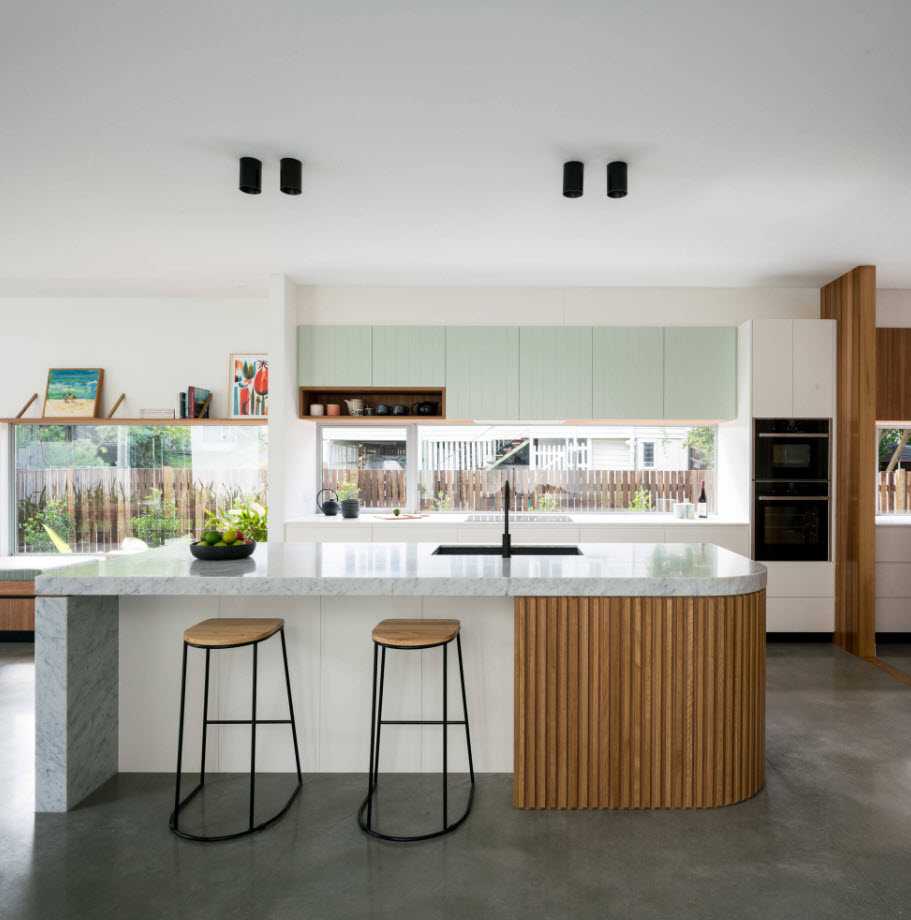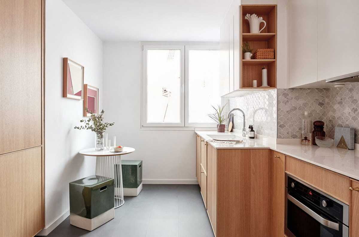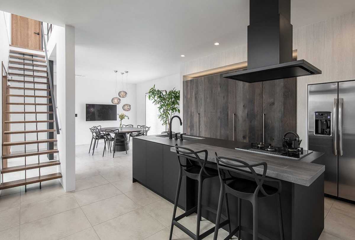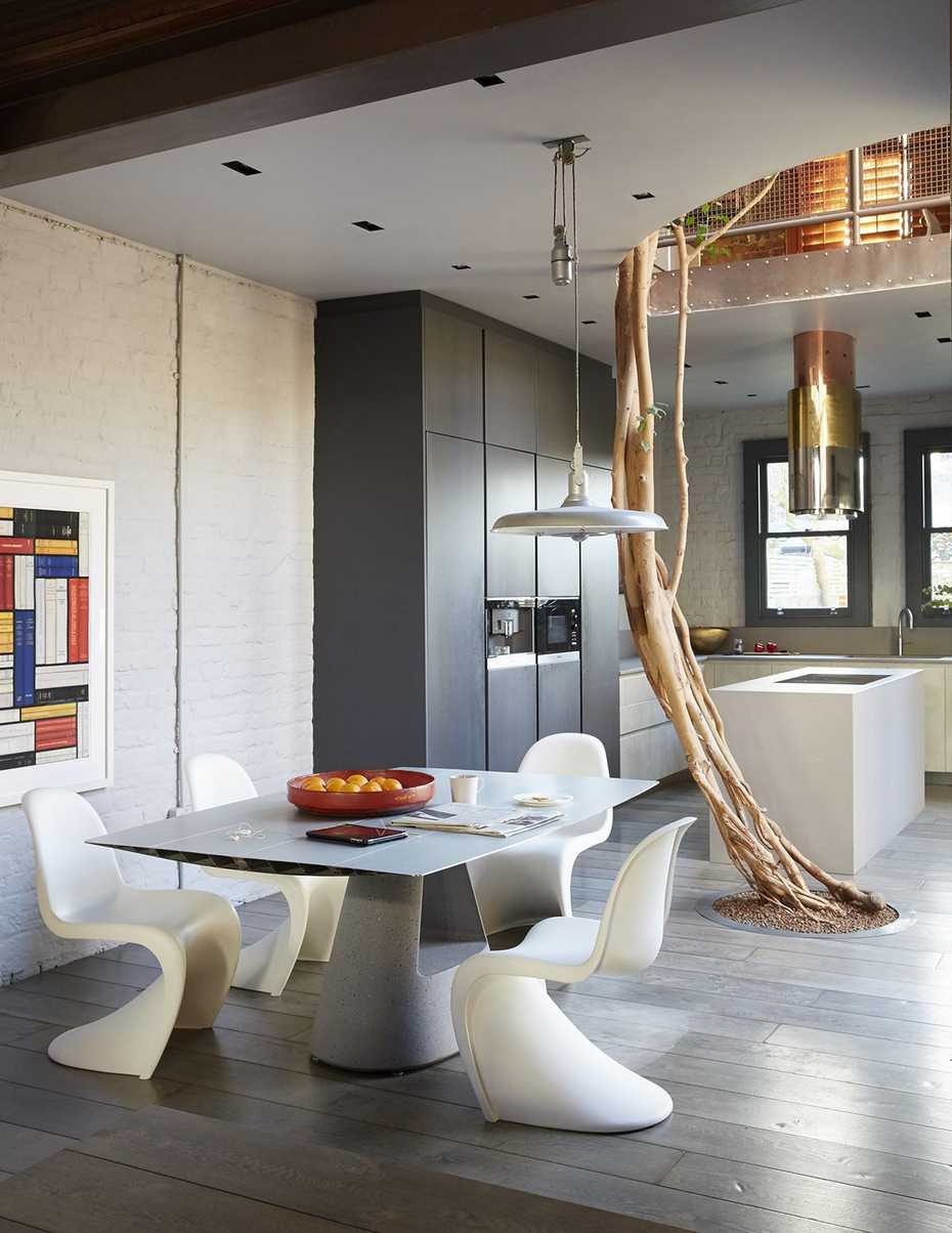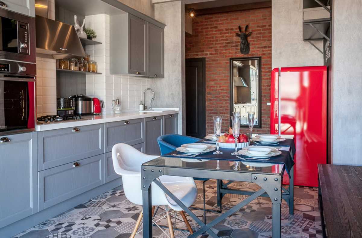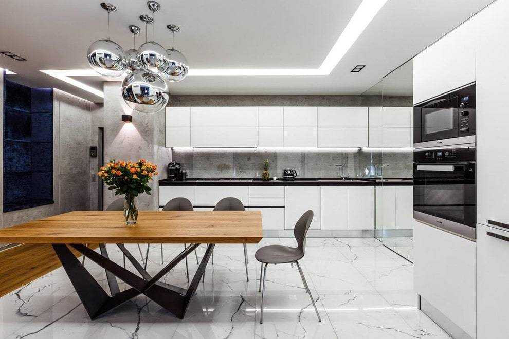 В сочетании со стульями из пластика или хромированной стали такая мебель станет основой кухни в стиле хай-тек, лофт или минимализм.