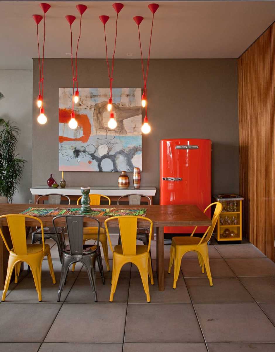 Сейчас модно приобретать одинаковой формы стулья с разным цветом обивки или окрашенные во всевозможные цвета. Это могут быть спокойные оттенки, например, белый и черный, вариации бежевого или же радужное многообразие. Первый случай уместен для стилей минимализм, модерн, а яркие предметы отлично впишутся в кантри и хай-тек.