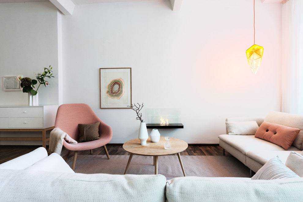 - Светлые дизайнерские модели пастельных оттенков (бежевых, персиковых, карамельных, светло-коричневых) можно располагать как на контрастном, так и аналогичном нейтральном фоне. Главное, разбавлять вторые интерьеры яркими деталями, чтобы образ помещения не казался скучным и однообразным.