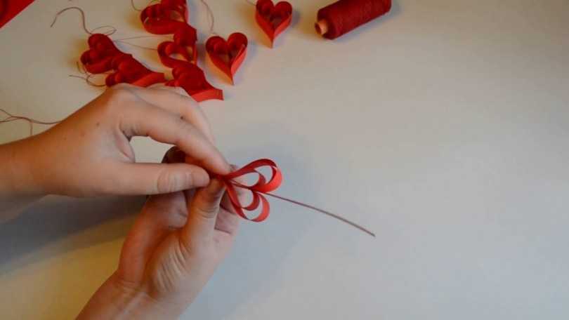 Следующая ступень — нанизывание сердечек на ленту (примите во внимание флористическую, она смотрится выигрышнее). После проделанного действия отрегулируйте расстояние компонентов.