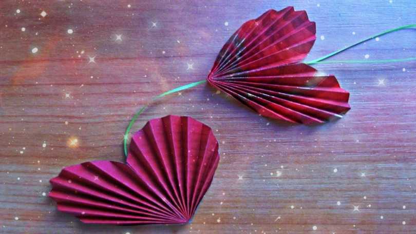 Создайте шаблон, т.к. формат и размеры сердец должны быть одинаковыми. Нужно сложить небольшой картон пополам. Место сгиба будет служить серединкой, разделяющей сердце.