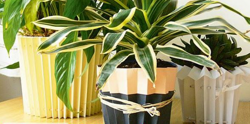 Горшок оклеивают гофрированной бумагой, например, от прокладок картонных коробок. Бумага наклеивается полосками, после чего их покрывают лаком. Внешне такие горшки выглядят стильно, ничем не уступают керамическим.