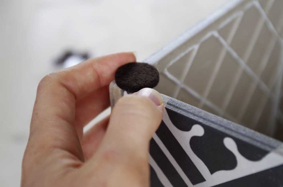 Из войлока вырезаем подходящие по размеру кружки или квадратики. Приклеиваем их к каждому углу на нижней части вазона.