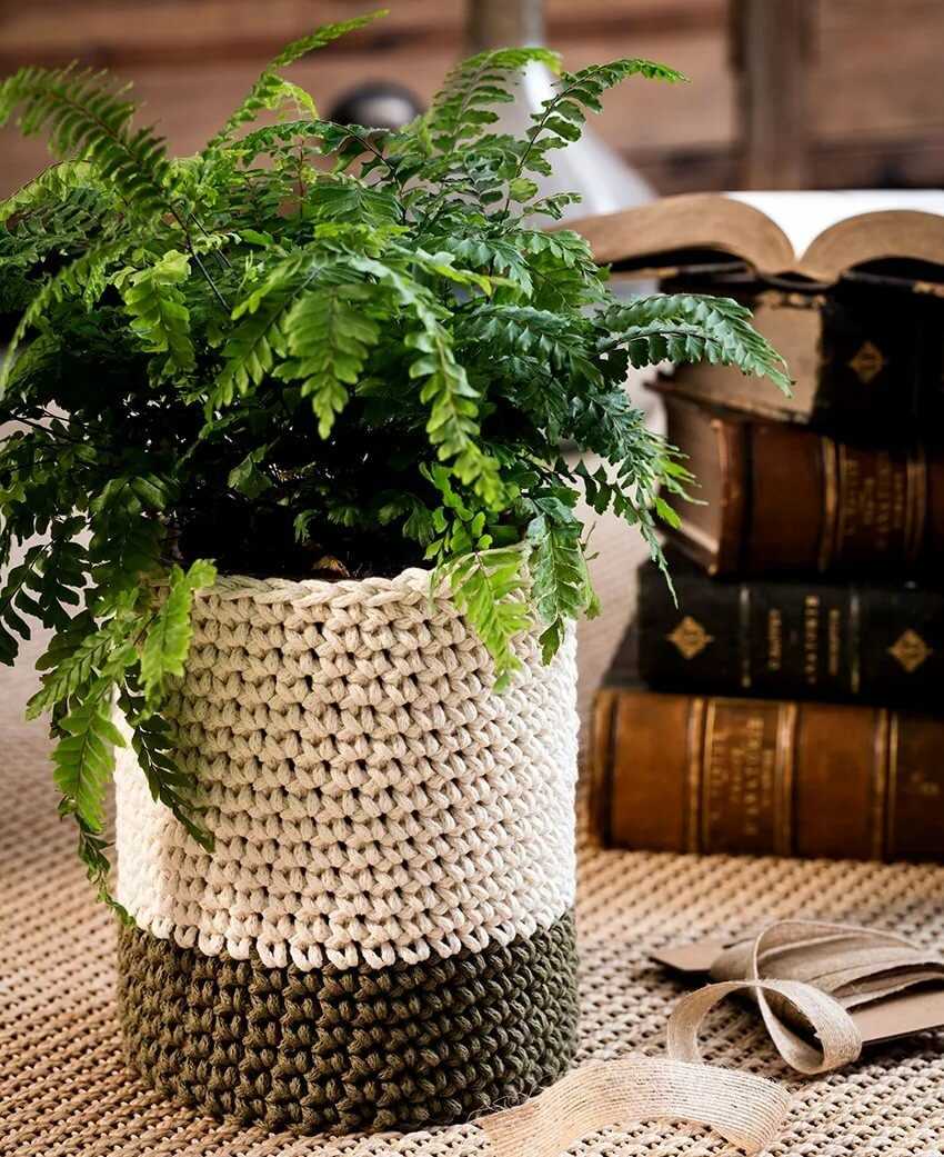 Кашпо должно гармонично вписываться в имеющийся интерьер. Для этого важно выбрать нити подходящих оттенков, перекликающихся с остальными гаммами в обстановке