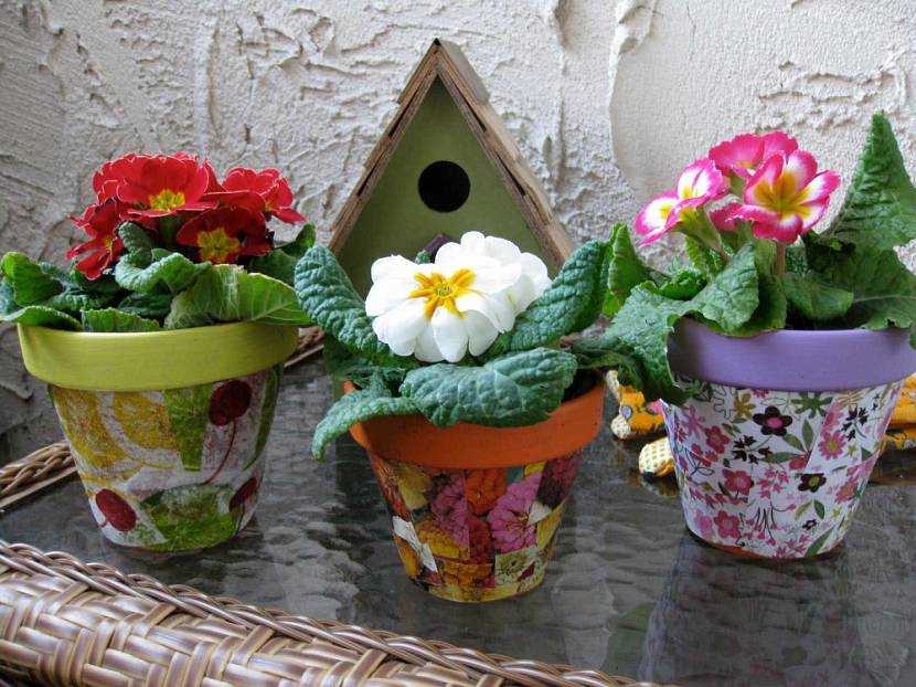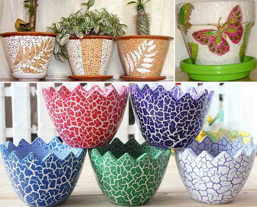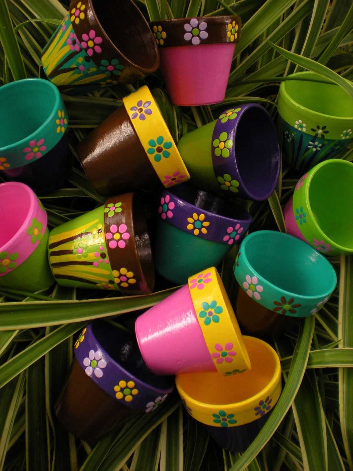 Для создания красивых предметов интерьера подойдут глиняные горшки, хотя и пластиковые не менее красивы.Обязательно следует обработать их несколькими слоями акрила, чтобы при поливе вода не просачивалась и не портила декор.