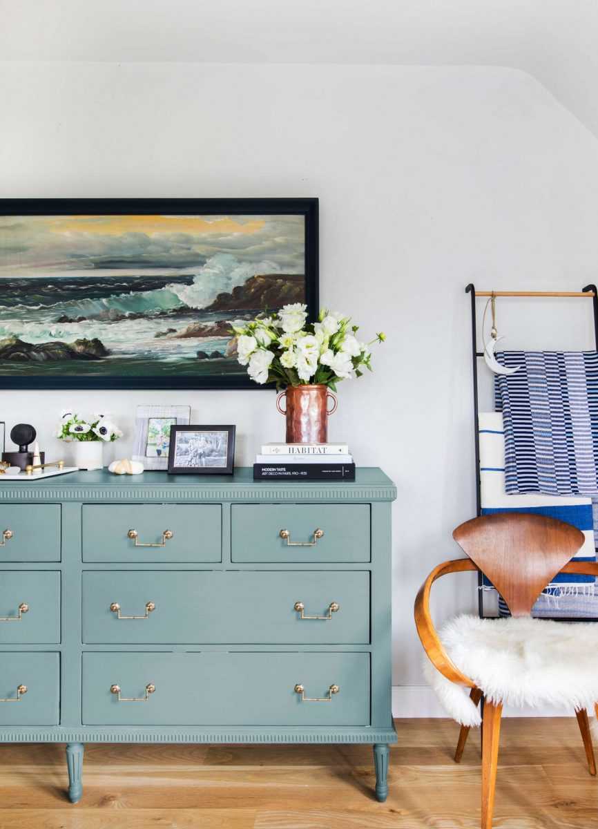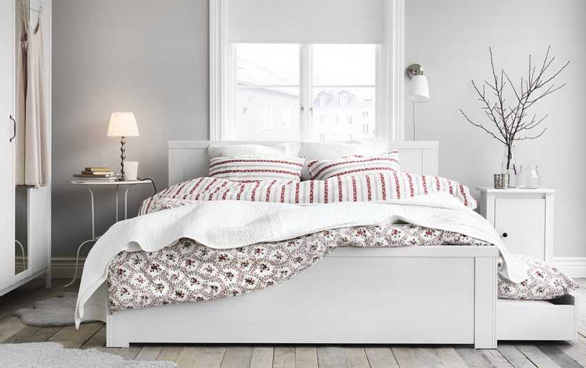 А вот без вместительного шкафа можно и обойтись, если квартира позволяет иметь гардеробную комнату. Для экономии места, как и в любой другой комнате, можно сделать встроенный шкаф в спальню. Для необходимых вещей подойдет небольшой комод или тумбы с выдвижными ящиками.