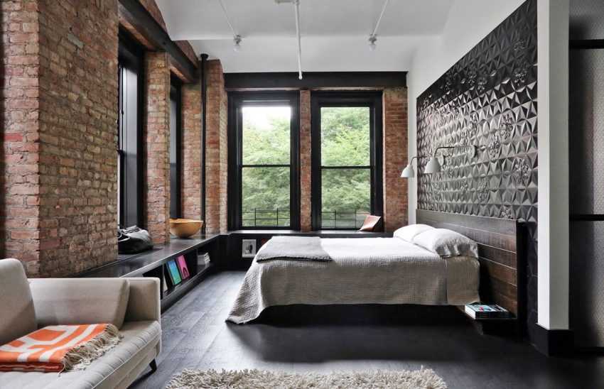 - В интерьерах в современном стиле эффектно смотрится декоративная кирпичная кладка. Чаще всего к подобным вариантам декорирования обращаются владельцы спальных комнат в стиле лофт. Специалисты рекомендуют оформлять таким образом только одну из стен.