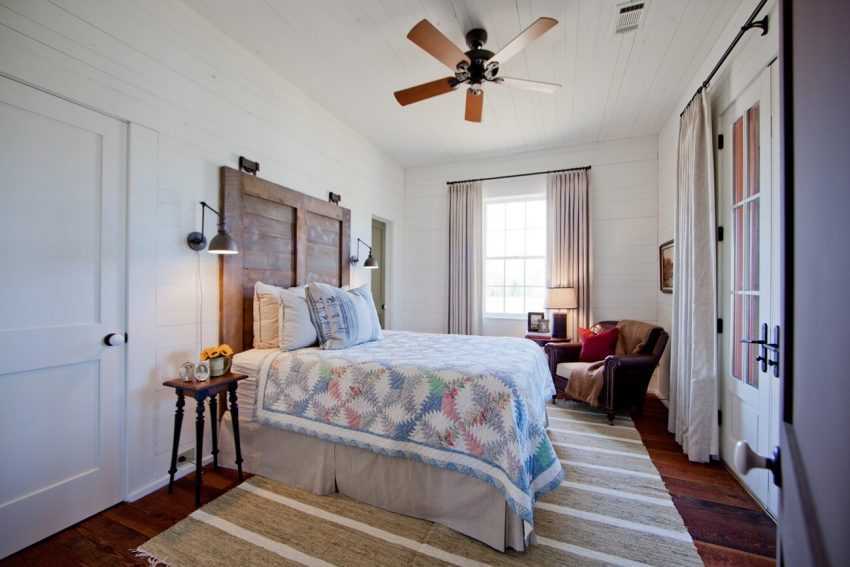 Для создания деревенского антуража кровать лучше выбирать кованую. Обычно с ними есть еще и полог, который легко заменяется занавесками. Они, в свою очередь, могут быть и аналогом штор в спальню, тем более создать своими руками их не так долго и сложно.