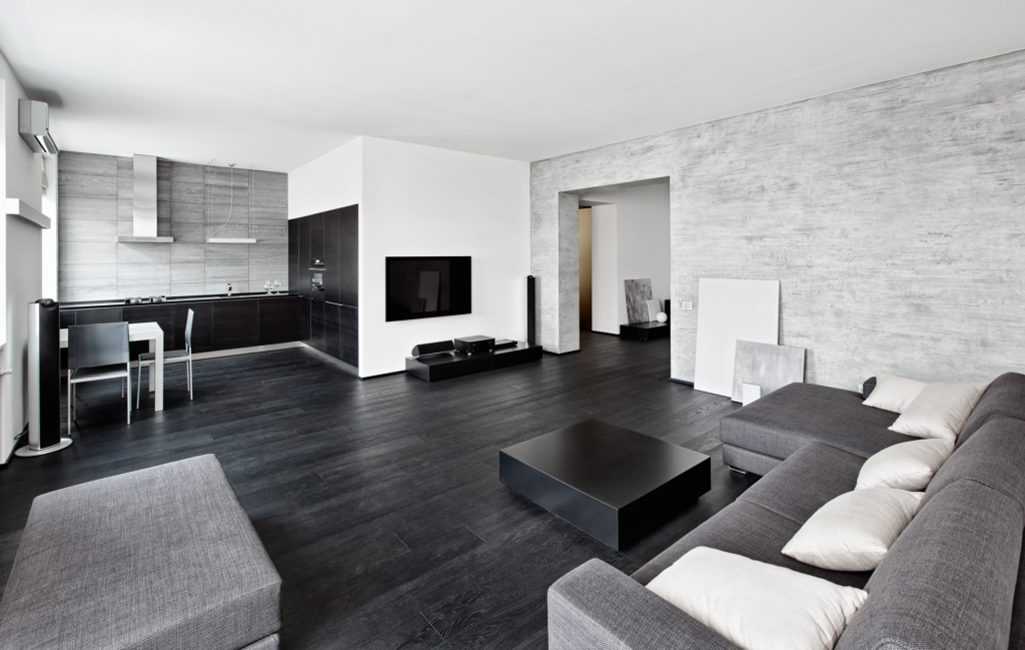 - белые стены и серая обивка мебели, серый с белым ковер, антрацитовые фасады и столешницы мебели;