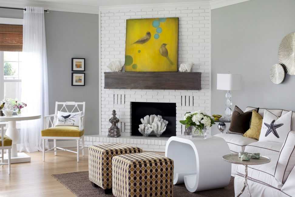 - Одна из стен декорируется белым, и она становится фоном для картин, напольных ваз, мягкой мебели, декоративных полок. Оставшиеся три – серым цветом.