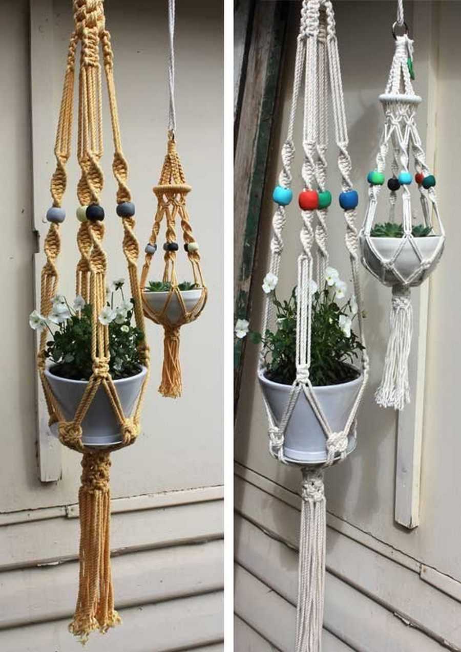 Всегда прекрасно выглядят настольные, настенные или подвесные кашпо для цветов, сделанные в технике макраме. Это древнее, известное во всем мире, рукоделие позволяет создавать крепкие узловые конструкции, в которые можно добавить различные декоративные элементы: большие каменные и деревянные бусины, пластиковые, либо глиняные цветы. Сейчас существует множество вариантов и подробных описаний для создания нарядных кашпо для растений своими руками. Схемы с точными данными легко можно найти в газетах или журналах, относящихся к этому типу рукоделия, а материалы лучше приобрести в специальном магазине или же заказать по Интернету (более дешевый вариант). После проведения дизайнерских манипуляций кашпо будет выглядеть как настоящее произведение искусства в вашем интерьере.