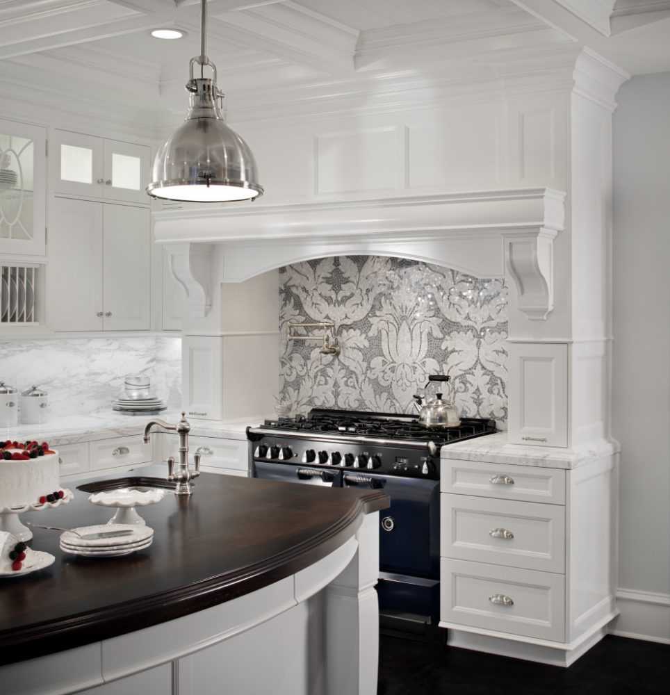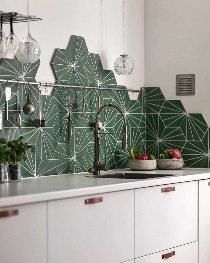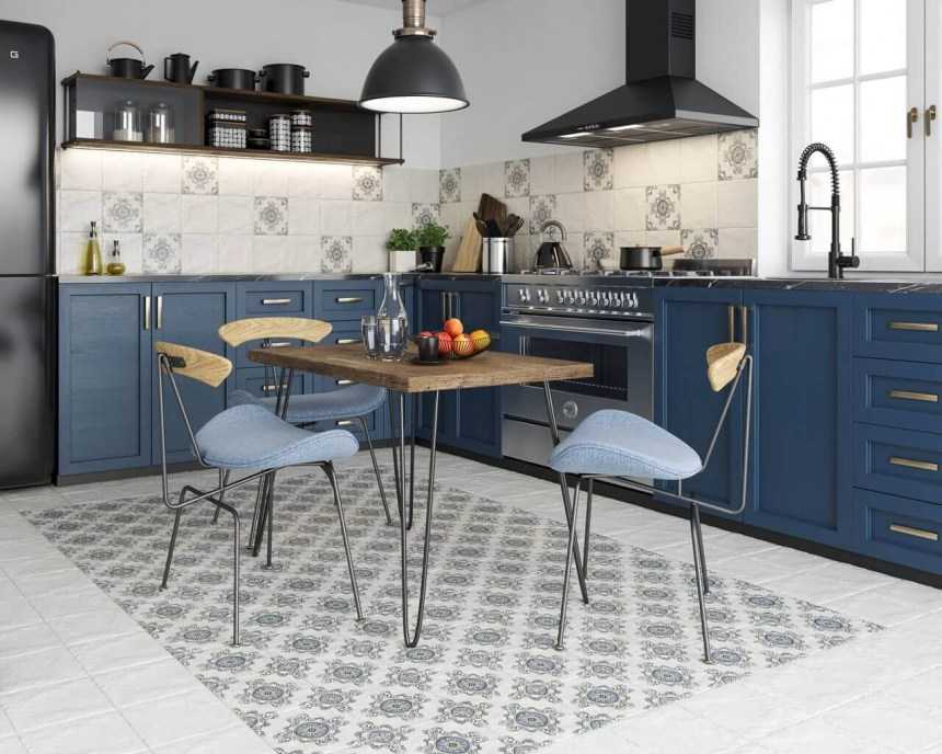 - Фартук из плитки благодаря использованию интересного орнамента может стать ключевым звеном всей концепции интерьера в кухне.
