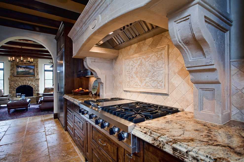 Одно из более проблемных мест – стена около рабочей поверхности стола на кухне, место над плитой или мойкой. Обычно эти места оформляются фартуками. Они могут быть сделаны из самых разнообразных материалов, например, из керамоплитки, стекла, цельного камня. Иногда их выполняют из керамогранитного материала, и это имеет ряд существенных преимуществ.