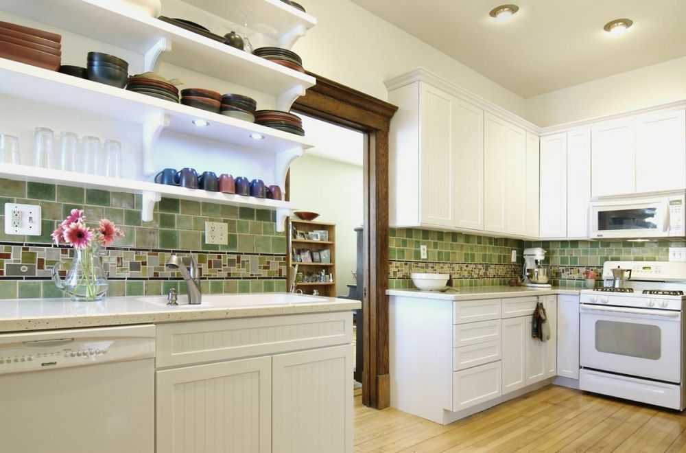Важно помнить, что сначала выкладывается фартук из плитки, а уже затем монтируется кухонный гарнитур