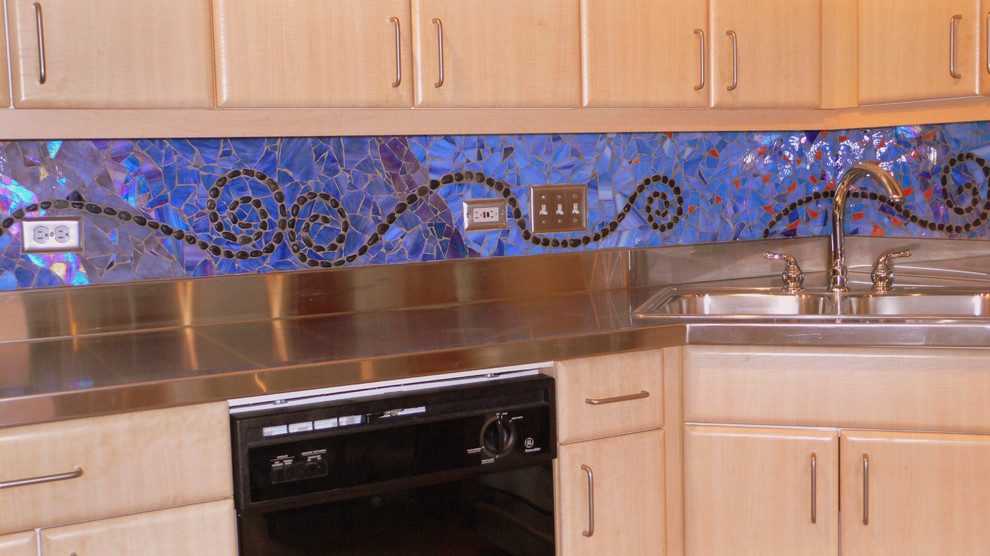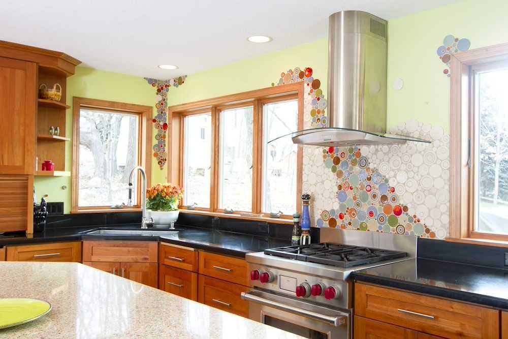 2Если фартук должен стать ярким центральным пятном кухни, то в дизайне можно использовать фотопечать, красочную мозаику, панно и другие варианты красочного дизайна.