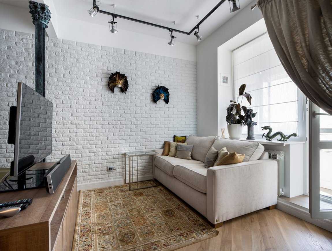 На фото частично окрашенный в белый цвет кирпич в дизайне небольшой студии 22 кв. м.