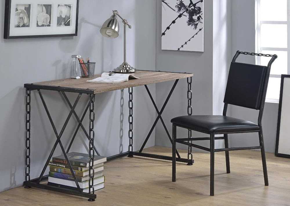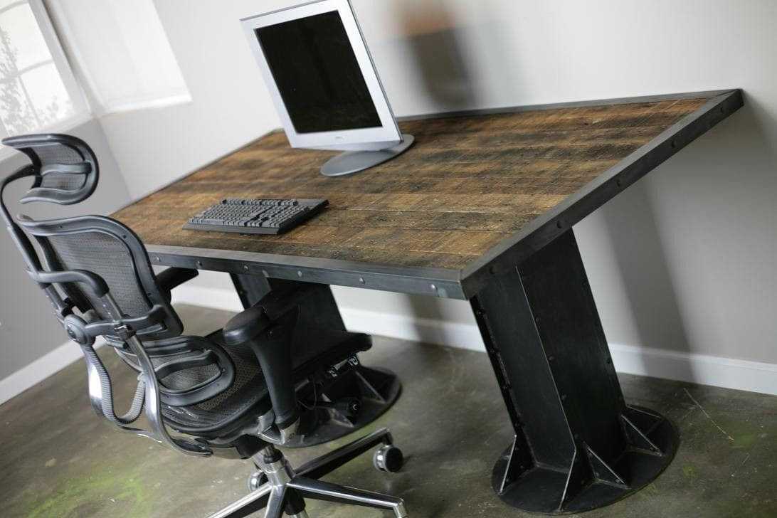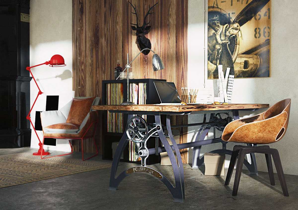 - Индастриал — наиболее популярное направление. Предполагает наличие излишней прямолинейности и брутальности. Опорная конструкция стола выполнена из обычных металлических труб без какого-либо декорирования.