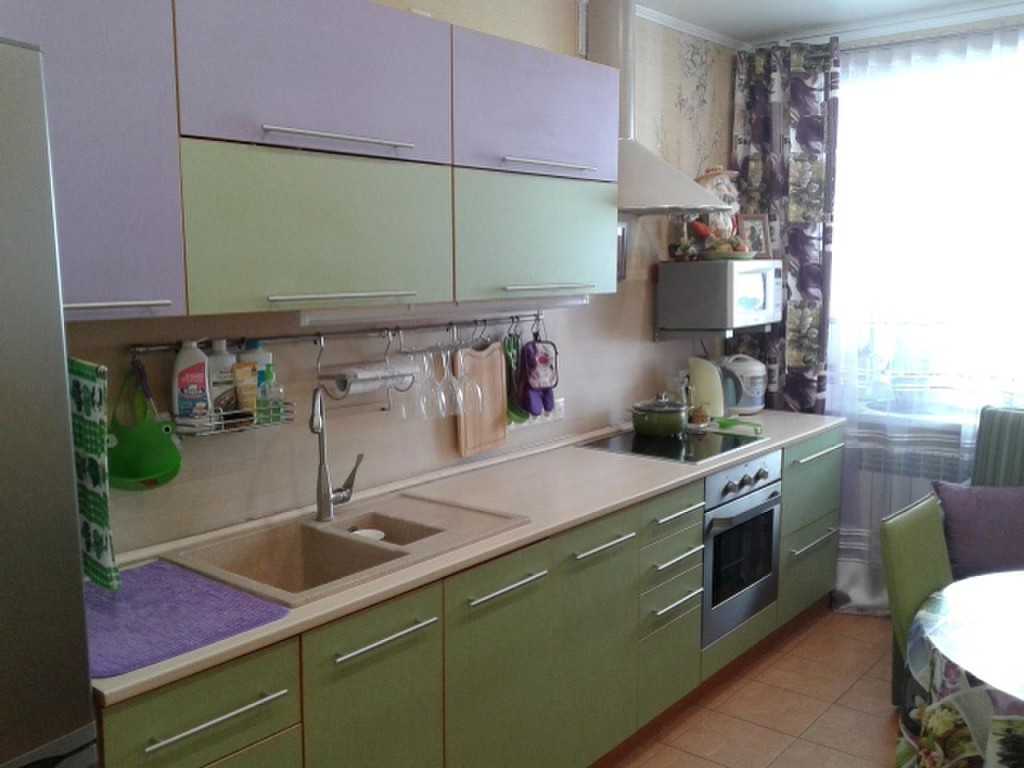 Зеленый в сочетании с бежевым может быть как насыщенным, так и более спокойным. Предпочтительнее подобрать зеленый гарнитур на бежевом фоне. Кроме того кухня может быть выполнена полностью в бежевой палитре, а зеленым разбавляют отдельные детали или дополняют дизайн интересными аксессуарами в такой тональности.