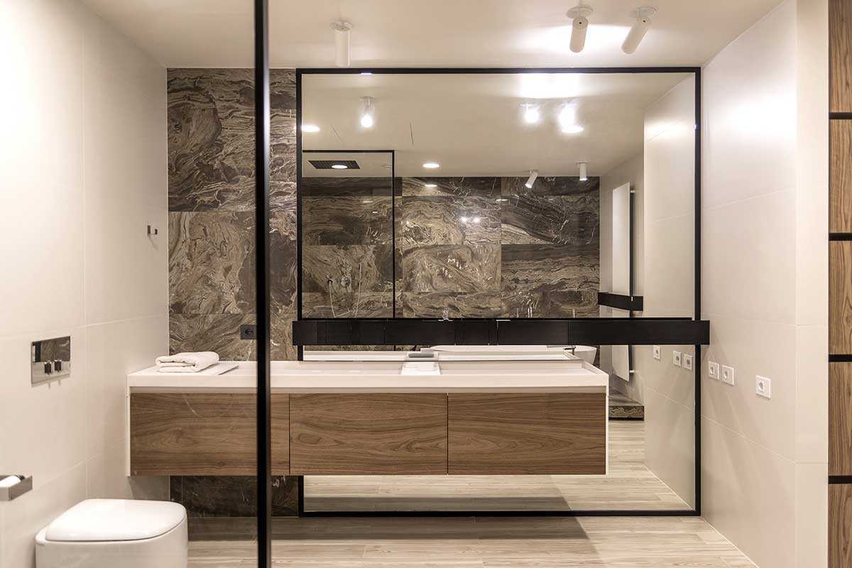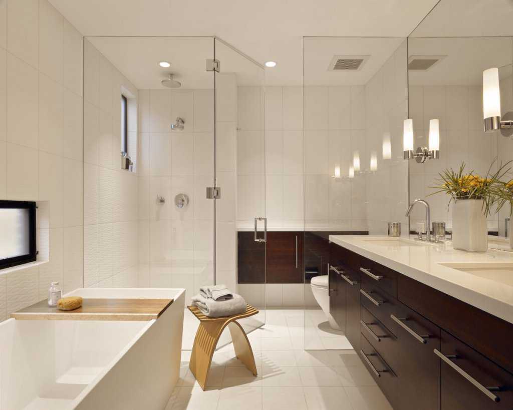 Комфорт и ничего лишнего – вот основное описание ванной комнаты в стиле минимализм. Благодаря четкой графике удается достичь эффекта чистоты. Здесь, как и в других помещениях, применяется монохром в отделке. Если используется керамическая облицовка стен и пола, то стыки незаметны. Это придает ванной целостный вид.Сантехника прямоугольной или квадратной формы удачно вписывается в отведенное для нее место и оставляет больше места по центру помещения.