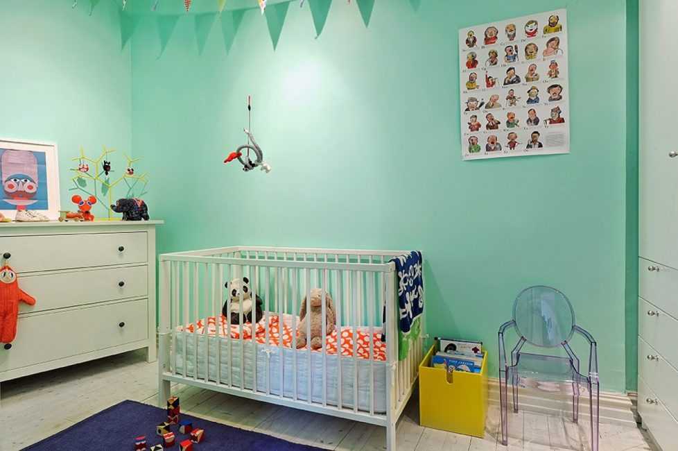 Психологи утверждают, что ребенок должен чувствовать себя в спокойствии и безопасности, чтобы полноценно и всесторонне развиваться. Поскольку мятный цвет состоит из сочетания зеленого и синего оттенков, которые не раздражают и не недоедают малышу. Мятный цвет для детского интерьера является универсальным, поэтому он отлично подходит для ребенка любого возраста и пола. Также такая обстановка позволит легко делать перестановку и легкий косметический ремонт.