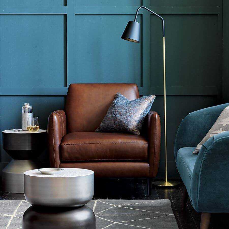 Еще один тренд этого сезона – комбинация различных материалов, текстур и фактур в интерьере. Так, на фотографии ниже предоставлен стильный напольный светильник от дизайнерской компании CB2, конструкция которого специально разработана Полом Изабелла. Оригинальный напольный торшер представляет собой необычный контраст классического матового черного цвета и глянцевой, прочной латуни. Стильный напольный светильник дизайнеры компании CB2 использовали для освещения уголка для чтения в гостиной, торшер в современном стиле отлично вписался в общую цветовую гамму интерьера комнаты.