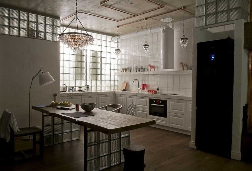 Можно вытяжку и не закрывать, а наоборот, сделать её достоянием всеобщего обзора. А “горячую” зону выделить дизайнерским решением в виде ниши из стеклянных блоков. И оригинально, и практично, так как стекло легко отмывается от любых кухонных загрязнений.