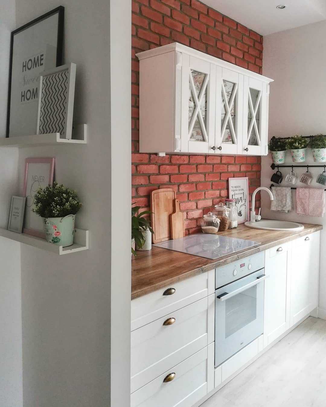 Эта маленькая кухня с «намеком» на стиль кантри спряталась в нише в гостиной. Вообще для небольших квартир размещать линейный гарнитур в подходящем «закутке» — это всегда удачное решение. Визуально его как будто бы не видно, но функционально кухня работает так же, как и отдельностоящий гарнитур.