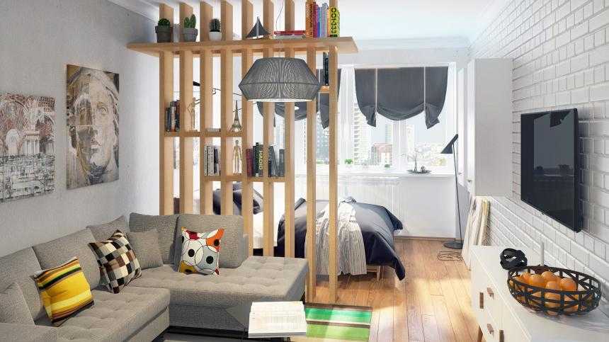 Разделение студий на части при помощи крупной мебели эстетичнее порою, чем за счет перегородок, несущих сугубо декоративную функцию. В недостаточно высоком помещении уместно применять низкую мебель, а лучше всего — немного приподнятую над полом. Встраивание комода в альков окажется эстетически уместным, если они выполнены из однотипного материала. Полки причудливой конфигурации, дополненные занавесками с яркими принтами, смотрятся очень оригинально.