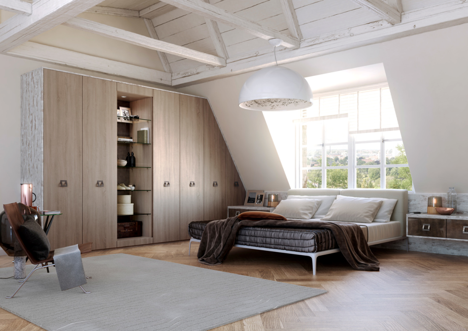 Часто встречаются мансардные помещения с балками, открытыми взору. Тогда люстру вешают прямо на одну из них