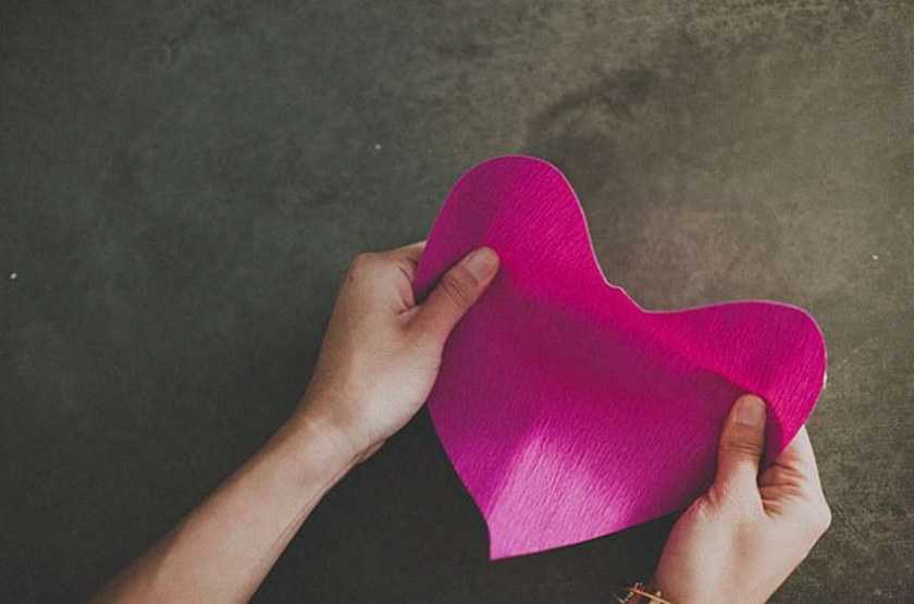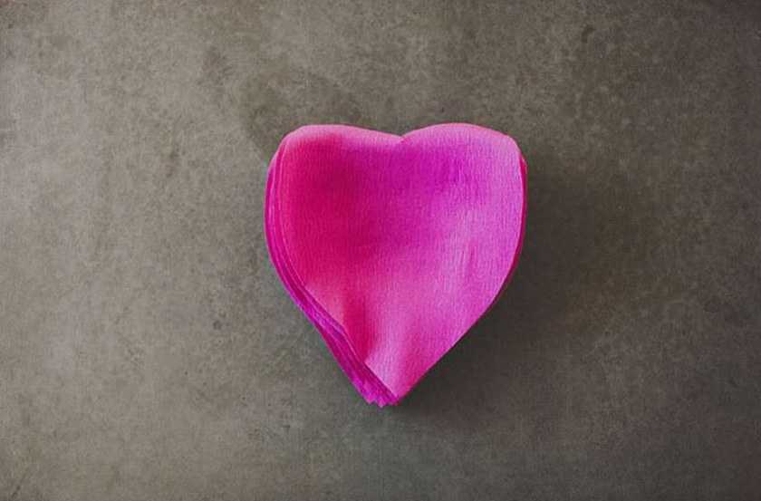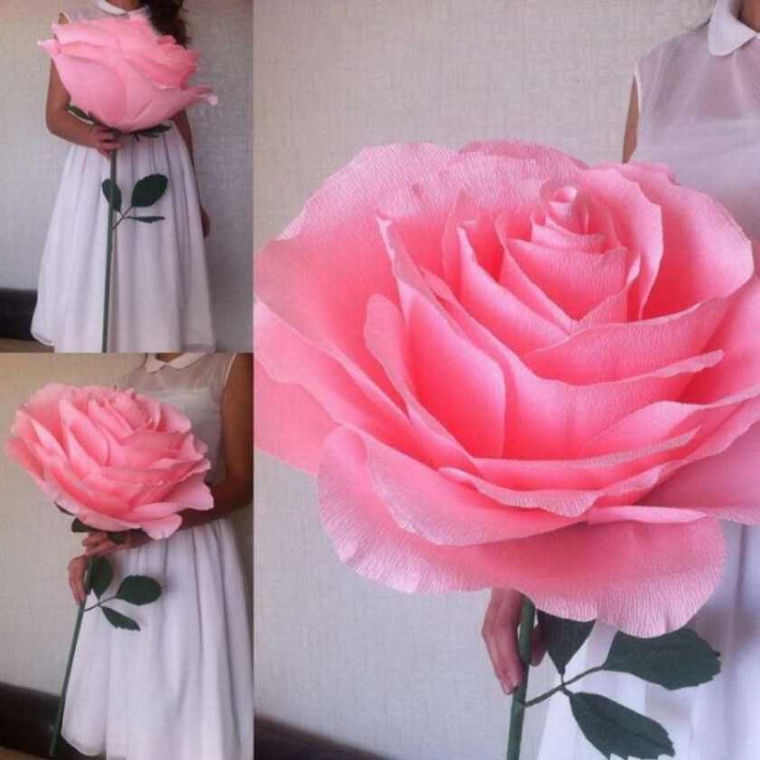 Эта идея вдохновила многих невест на создание собственной версии гигантских цветов из бумаги. Отрежьте 5-6 лепестков и 15 лепестков в форме сердца из гофрированной бумаги. Сложите 2 кусочка бумаги друг на друга, затем положите 1 копию шаблона сверху и скрепите. Не рекомендуется резать более 2 слоев гофрированной бумаги за раз, так как края будут неровные. Вырежьте 3 листа и 1 чашечку из зеленой гофрированной бумаги. Затем сделайте стебель розы. Возьмите 3 куска стебля и заверните в цветочную ленту. Обеими руками вытяните из центра лепесток наружу. Это создаст чашечку. Переверните лепесток и используйте круглый карандаш, чтобы свернуть верхнюю часть. После этого сделайте бутон розы — внутреннюю часть. Возьмите один лепесток в форме слезинки и оберните вокруг цветочной проволоки. Чтобы закрепить, используйте больше ленты.