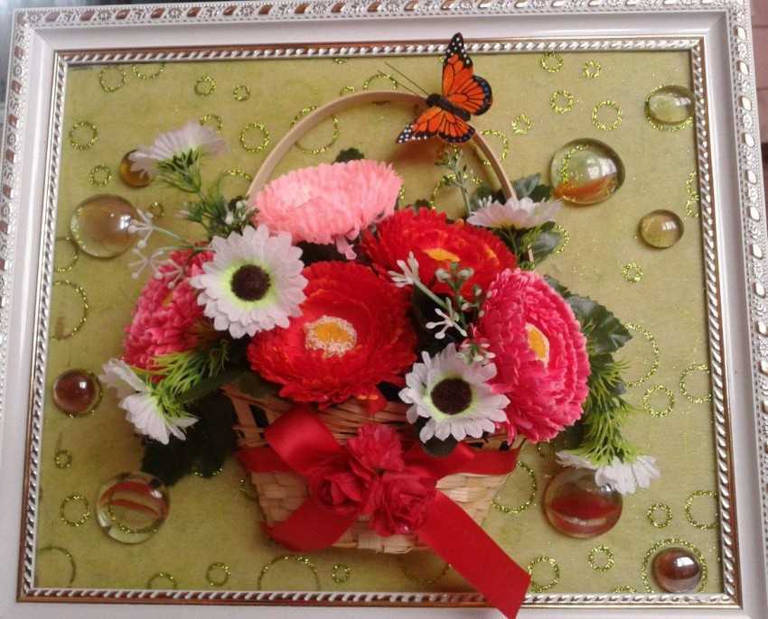Из гофрированной или жатой цветной бумаги создается не менее привлекательное панно на стену, представляющее собой цветочную композицию. Сперва гофра нарезается полосками, ширина которых составляет 5 сантиметров, а длина достигает 10 сантиметров. Все уголки полосок закругляются. Кусочек фольги скатывается для формирования серединки цветка. Горячим клеем она фиксируется на основе цветка, представляющей собой небольшой кружочек из фетра или картона.